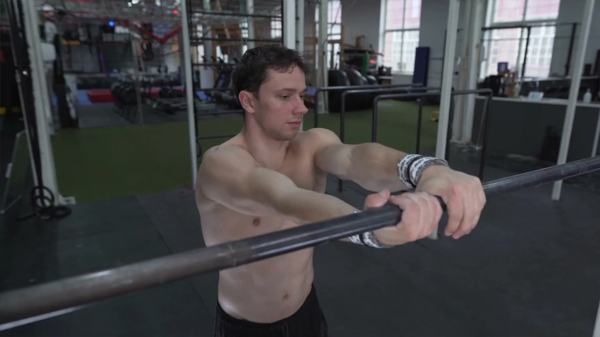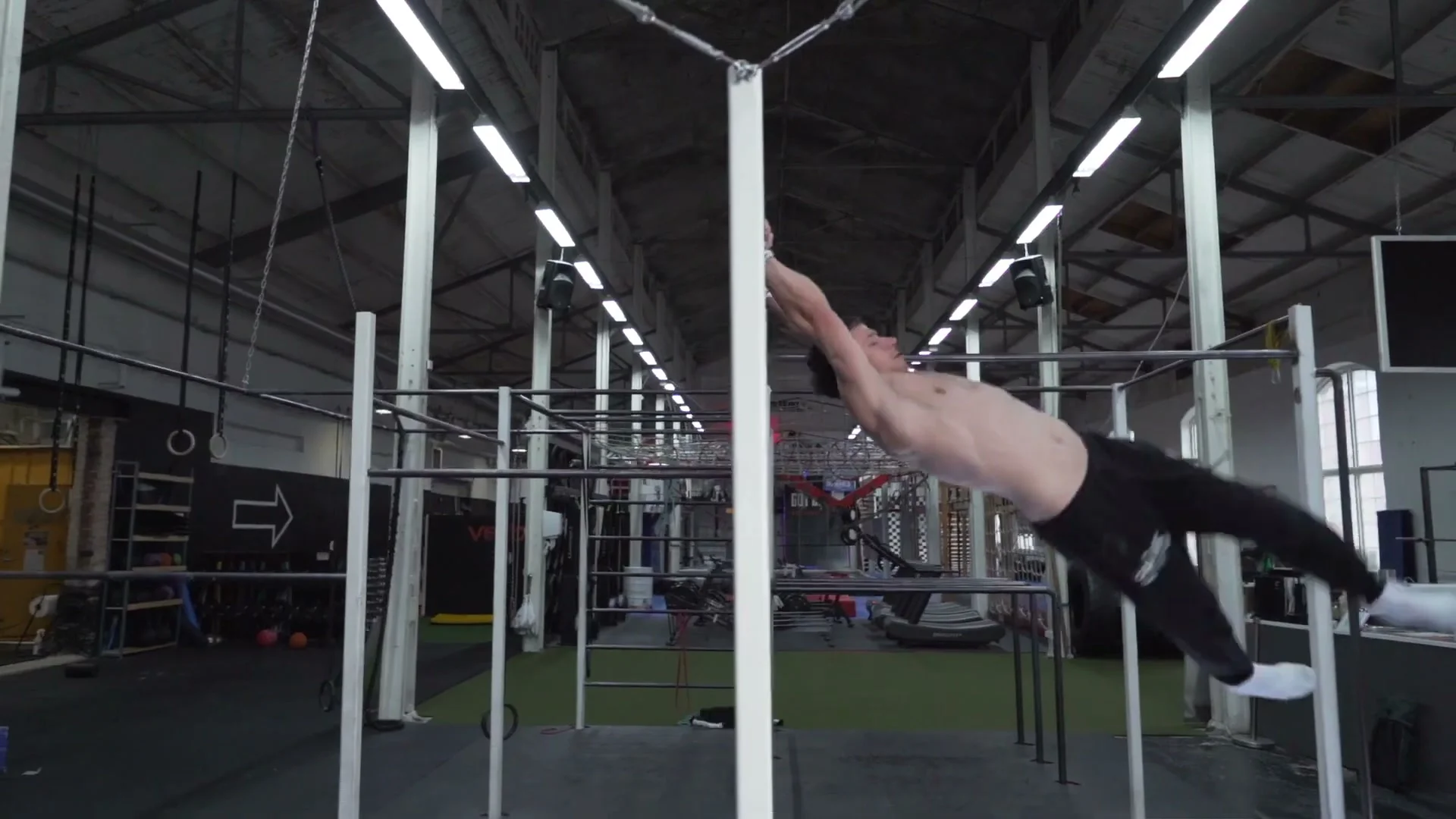 The landing goal for the first rotation is to arrive with the upper body more forward than a standard swing 360 finish. Landing more forward means the arms are already in a better position to reach the bar for the mixed grip catch.