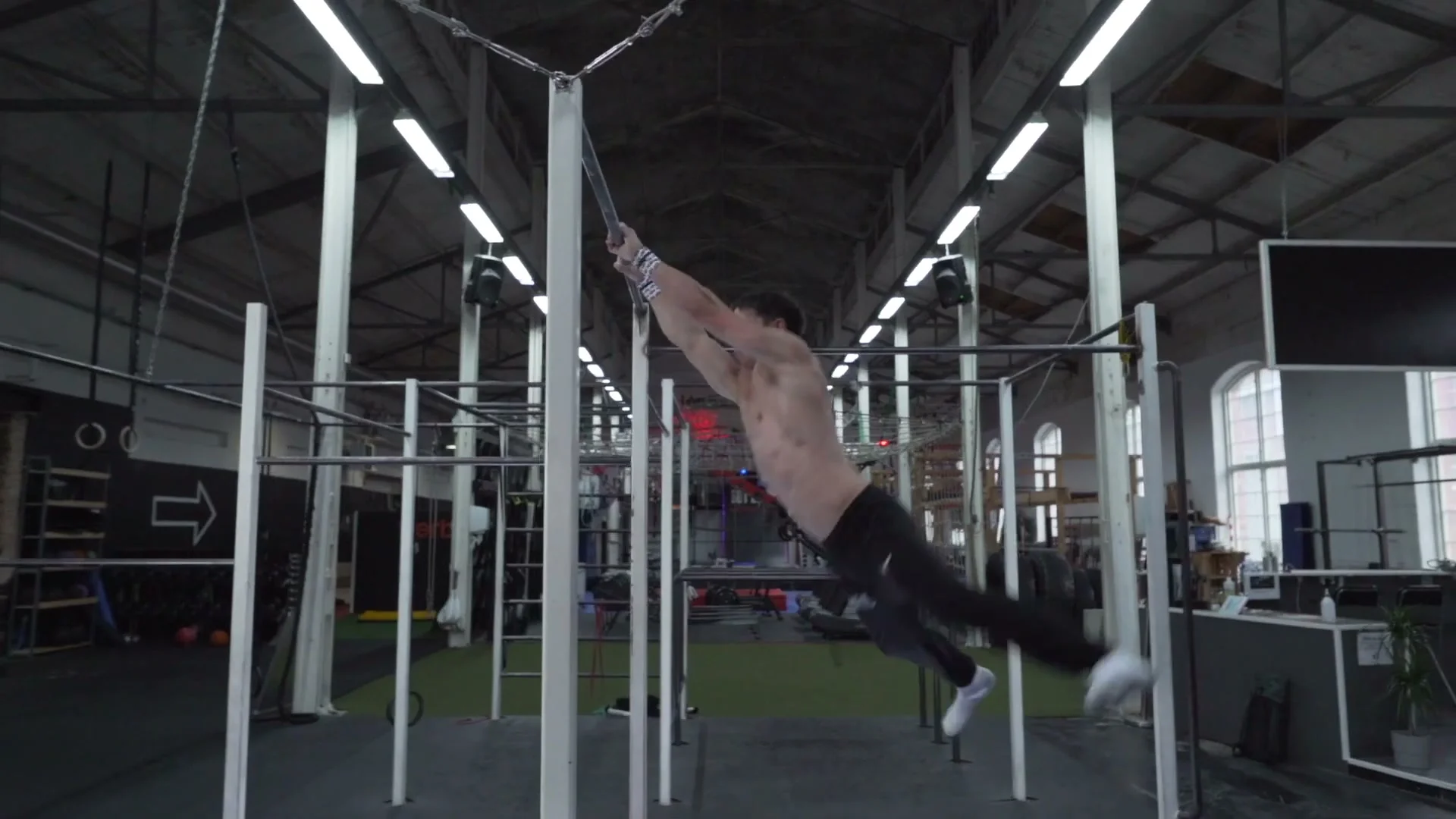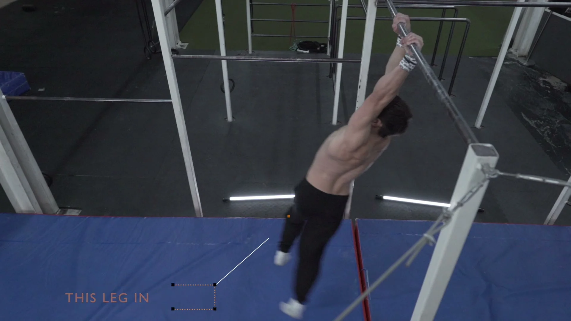 This step separates the double 360 from the swing 360. When swinging backward, twist the lead leg and hip inward toward the opposite side you are rotating to. This is the wind-up. When you come under the bar at the bottom of the swing, reverse: twist the hips and lead leg back toward the rotation side. This reversal is what generates the extra momentum needed for a second rotation.